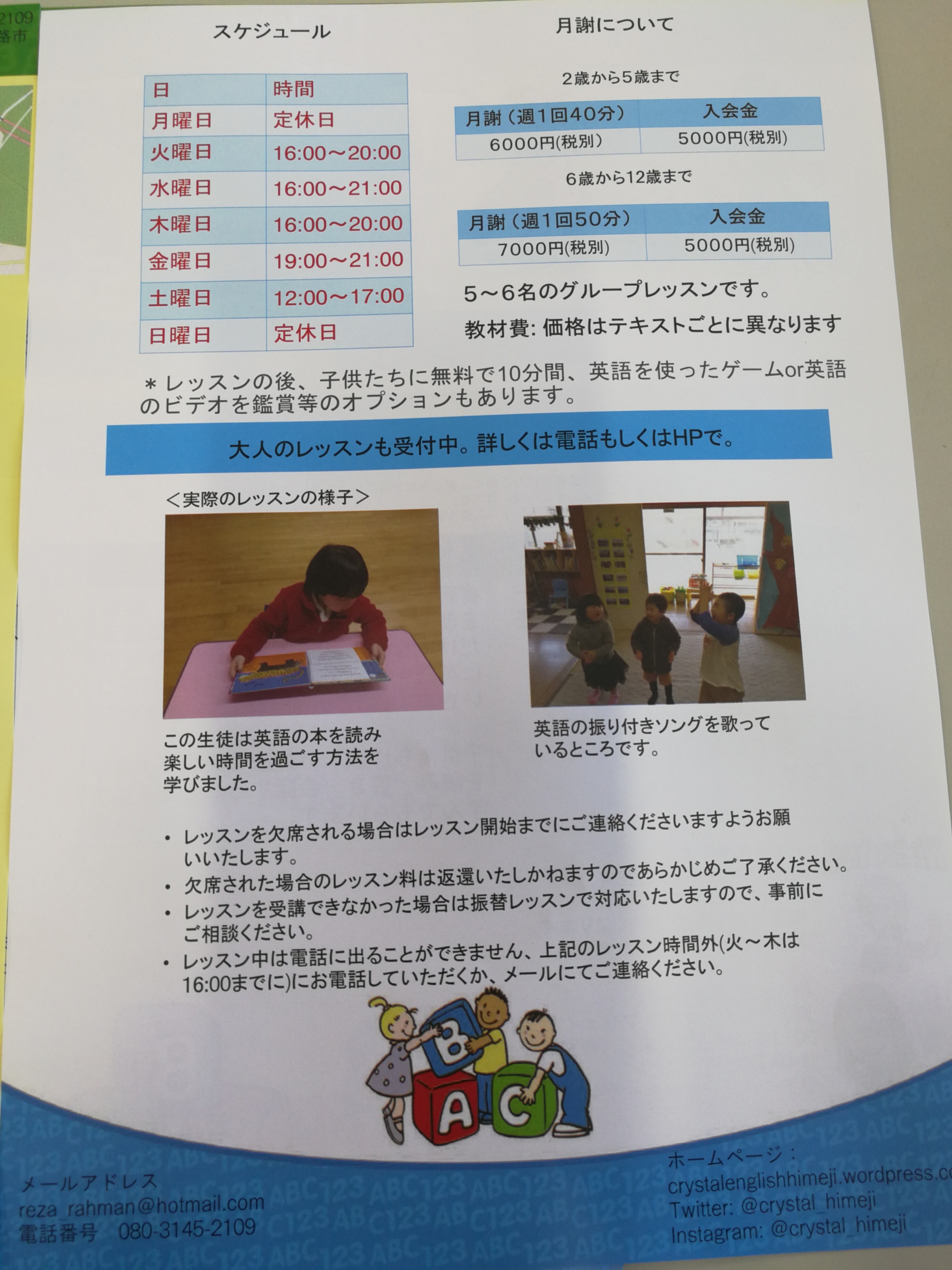 チラシが届いた。 Posted byrezainjapanMar 4, 2017Posted inUncategorized やった作ったチラシが届いた。友達と生徒の両親と他の人はありがとうございます。 Share this: Click to share on X (Opens in new window) X Click to share on Facebook (Opens in new window) Facebook Like Loading... Related